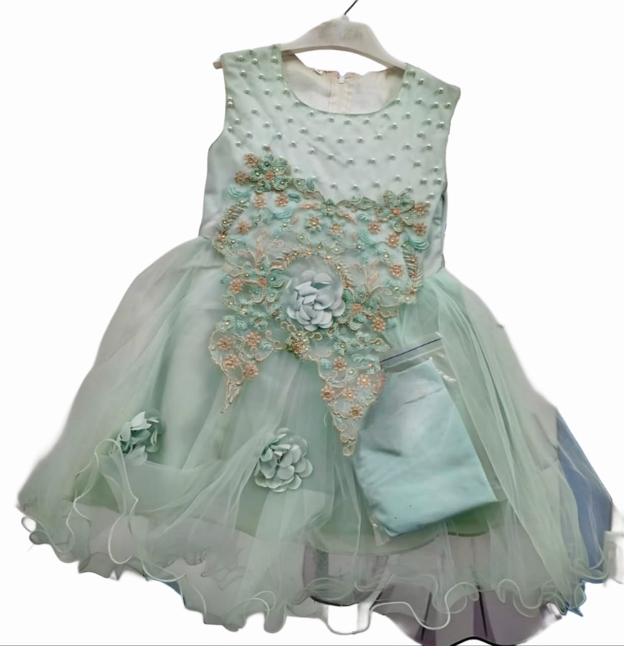 Ironing: If ironing is absolutely necessary, use the lowest heat setting (synthetic/silk setting) and place a thin cotton cloth over the dress to protect the fabric and embellishments. Never iron directly over the pearls or floral appliques. Steaming from a distance is a gentler alternative.