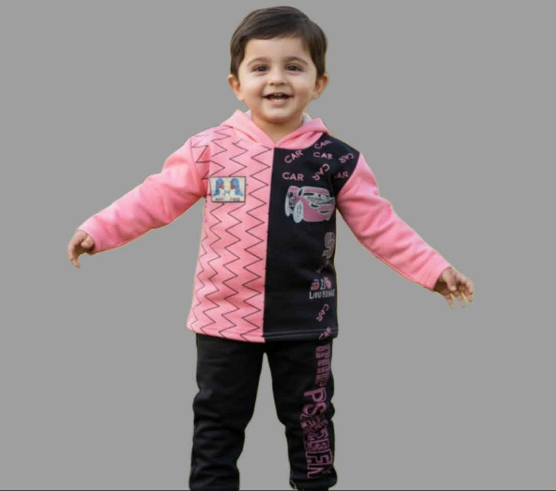 The set is completed with matching black sweatpants that feature coordinating pink text prints ("SPEED FOR...") down the leg, ensuring a coordinated and spirited look. Made from a comfortable, durable cotton blend, this outfit is ready for playtime adventures.
